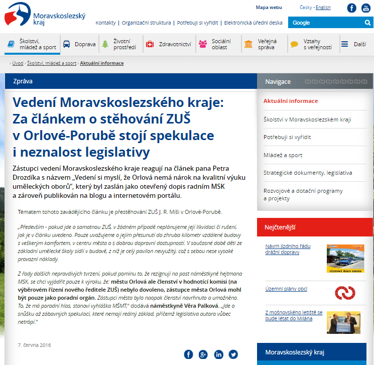 I když jde o různé školy, mohou mít změny, které školský odbor v těchto institucích provádí hodně společného. Snad proto si také stále rostoucí zájem široké veřejnosti, vysloužil negativní kritiku přímo z Krajského úřadu, který nám adresovala ještě tehdejší náměstkyně hejtmana pro odbor školství, Mgr. Věra Palková. Redakce se proti ostré kritice ohradila přímo na Krajském zastupitelstvu, a byli jsme v očekávání, že nám bude paní náměstkyně věcně argumentovat – nestalo se tak, Palková se z toho na zastupitelstvu vykroutila a do dnešního dne jsme se ani po urgenci slíbené odpovědi nedočkali. Připomenout si o co šlo si můžete zde. Stránka z webu Krajského úřadu Moravskoslezského kraje byla z nejasných důvodů odstraněna. Redakce má však její kopii, kterou si můžete prohlédnout zde.